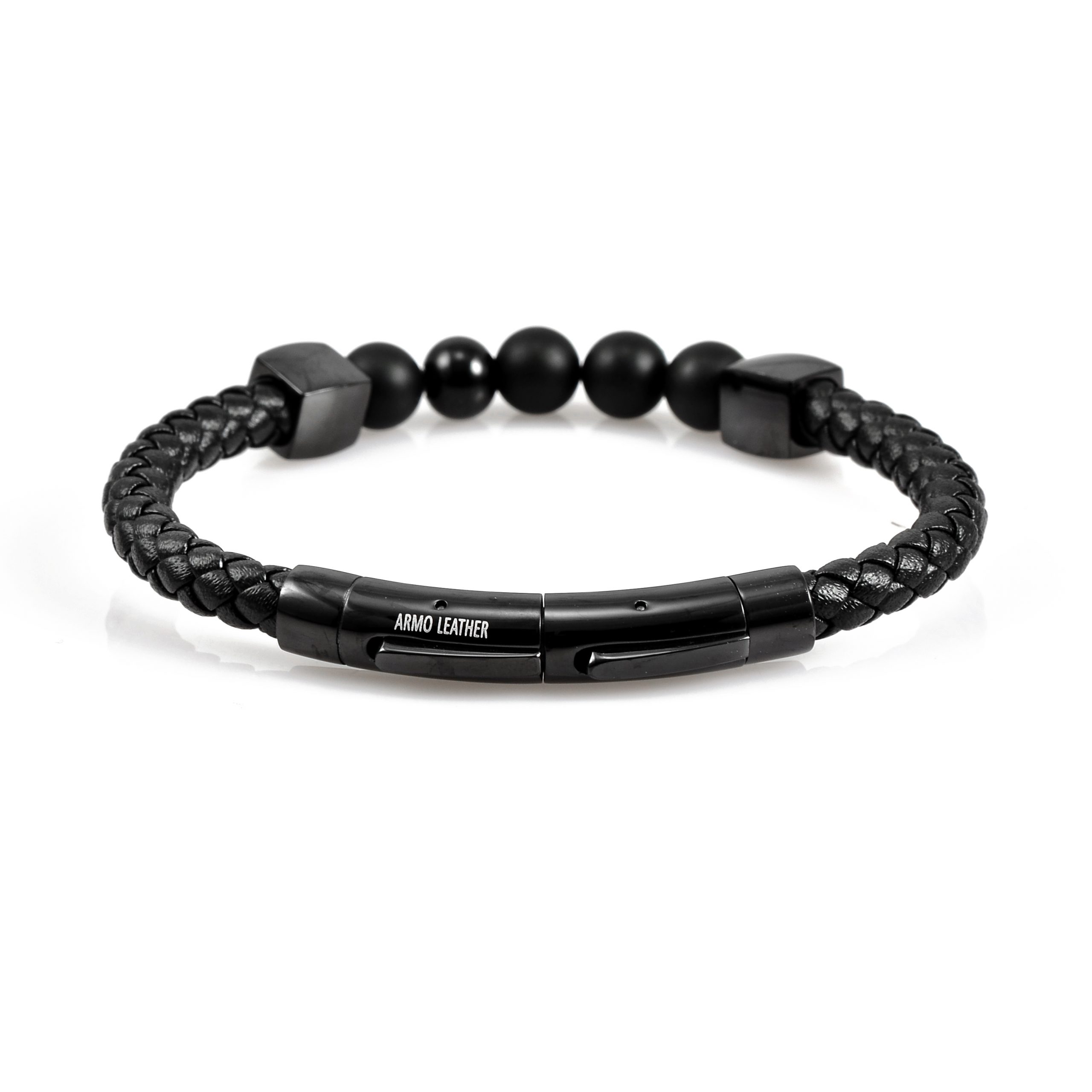 Herrenarmband – Geflochtenes schwarzes Leder mit Kanten & schwarzen Achat-Edelsteinen mit verstellbarem Verschluss