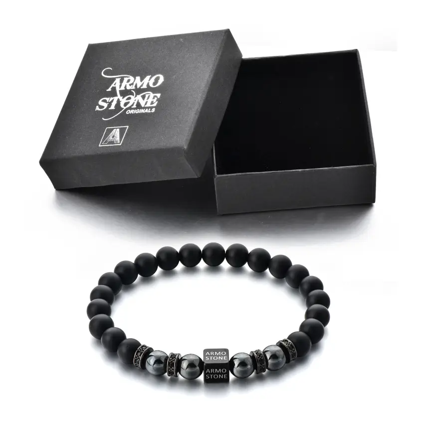 Die 8 mm grossen Natursteine sind auf ein robustes, elastisches Band gefädelt, das sich angenehm an das Handgelenk anpasst. Ein Edelstahlwürfel mit Armo-Logo setzt einen modernen Akzent und garantiert die langlebige Qualität von Armo Accessories.