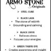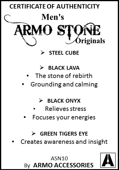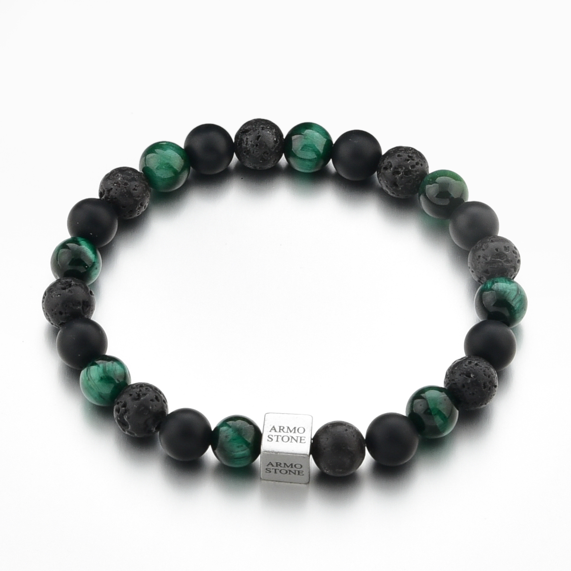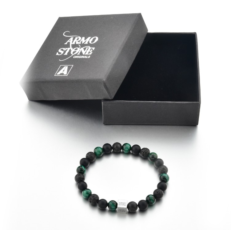 Die 8 mm grossen Natursteine sind auf ein starkes, elastisches Band gefädelt und passen sich angenehm dem Handgelenk an. Ein Edelstahlwürfel mit Armo-Logo setzt einen modernen Akzent und steht für die langlebige Qualität von Armo Accessories.