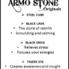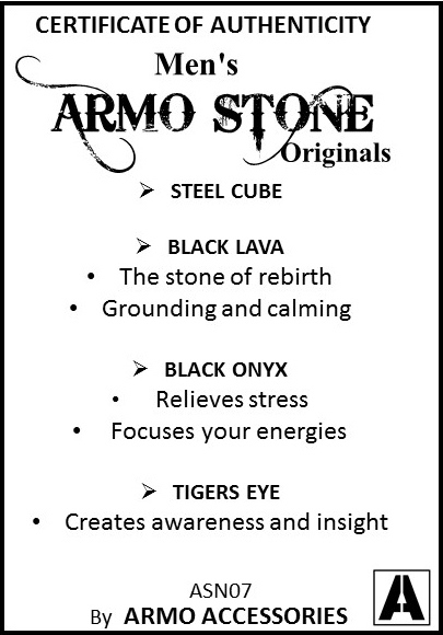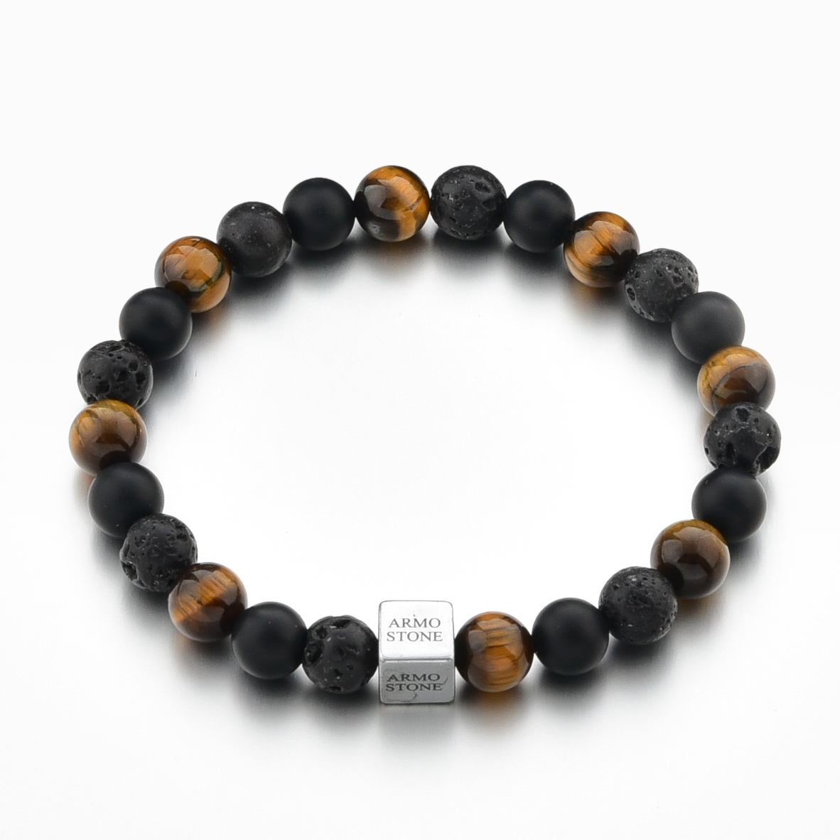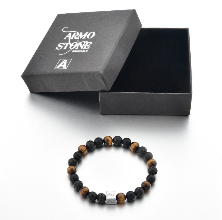 Die 8 mm grossen Natursteine sind auf ein starkes, elastisches Band gefädelt und passen sich angenehm an das Handgelenk an. Ein Edelstahlwürfel mit Armo-Logo ergänzt das Design und garantiert die langlebige Qualität von Armo Accessories.