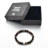 Armband aus schwarzer Lava, mattem Onyx und Tigerauge-Steinen (8 mm) mit elastischem Band und Edelstahlwürfel. Kraftvoll, elegant, vielseitig tragbar.