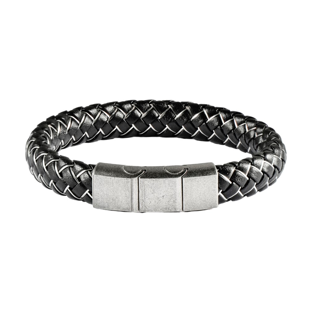 Dieses Herrenarmband kombiniert flach geflochtenes schwarzes Echtleder mit einem geflochtenen Edelstahl-Draht – ein markantes Accessoire mit modernem Charakter. Die besonderen antikfarbenen, magnetischen Interlocking-Verschlüsse sorgen für einen sicheren Halt und unterstreichen den edlen Look.